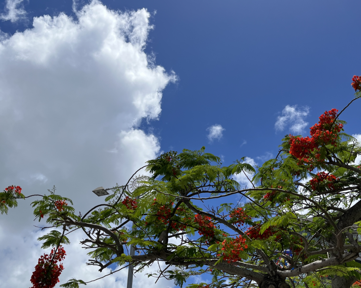予防を終えてスッキリ、嬉しい言葉を聞けた帰り路、梅雨明けした青空に朱色の花を咲かせたホウオウボクの木がとてもきれいでした。