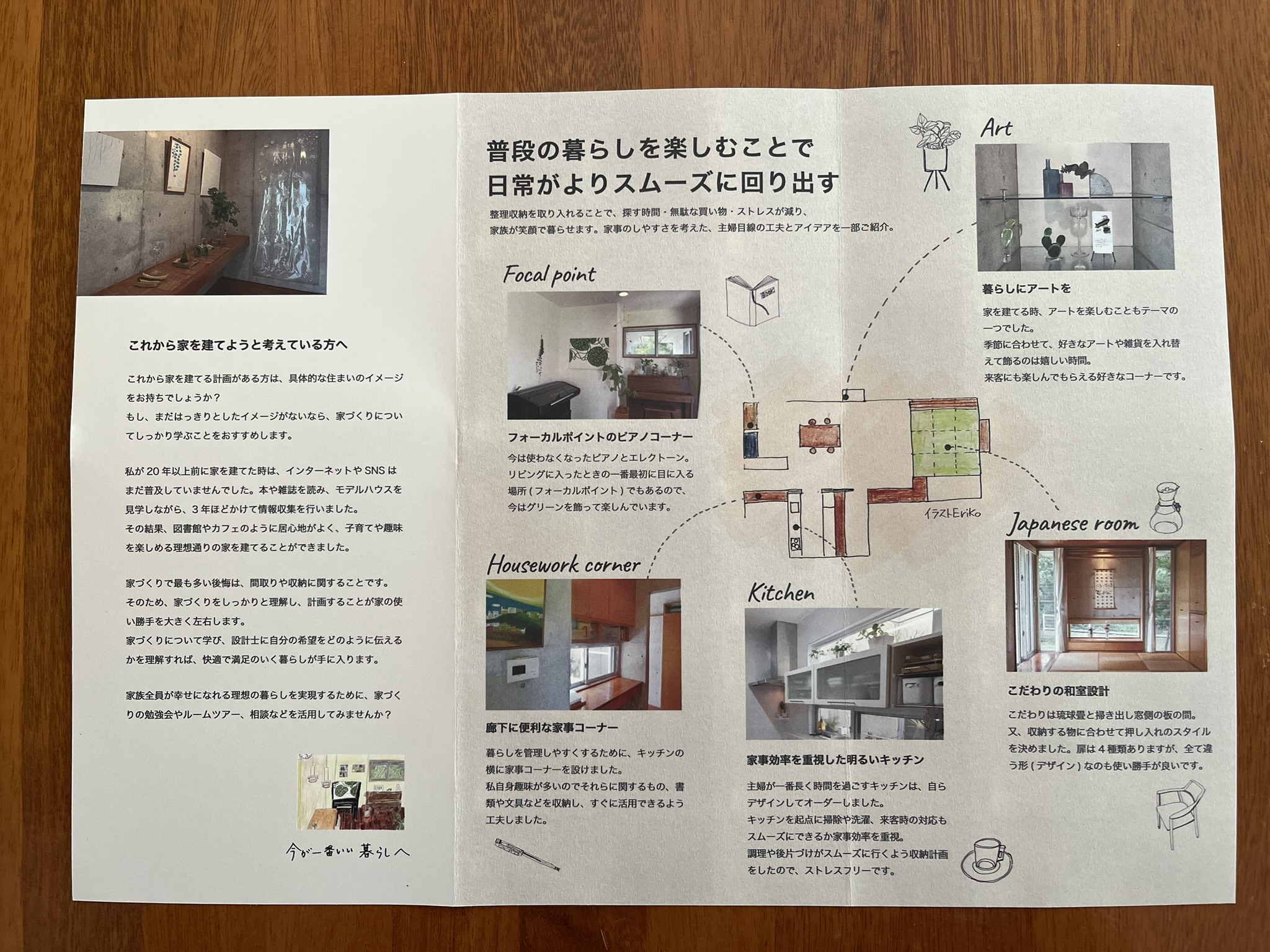 後悔のないよう、暮らしやすい家づくりを一緒に考えていきたい、家づくりを考えている若いママさんのお手伝いがしたいそんな想いがあり、プロの方にお願いをしてリーフレットにしました。