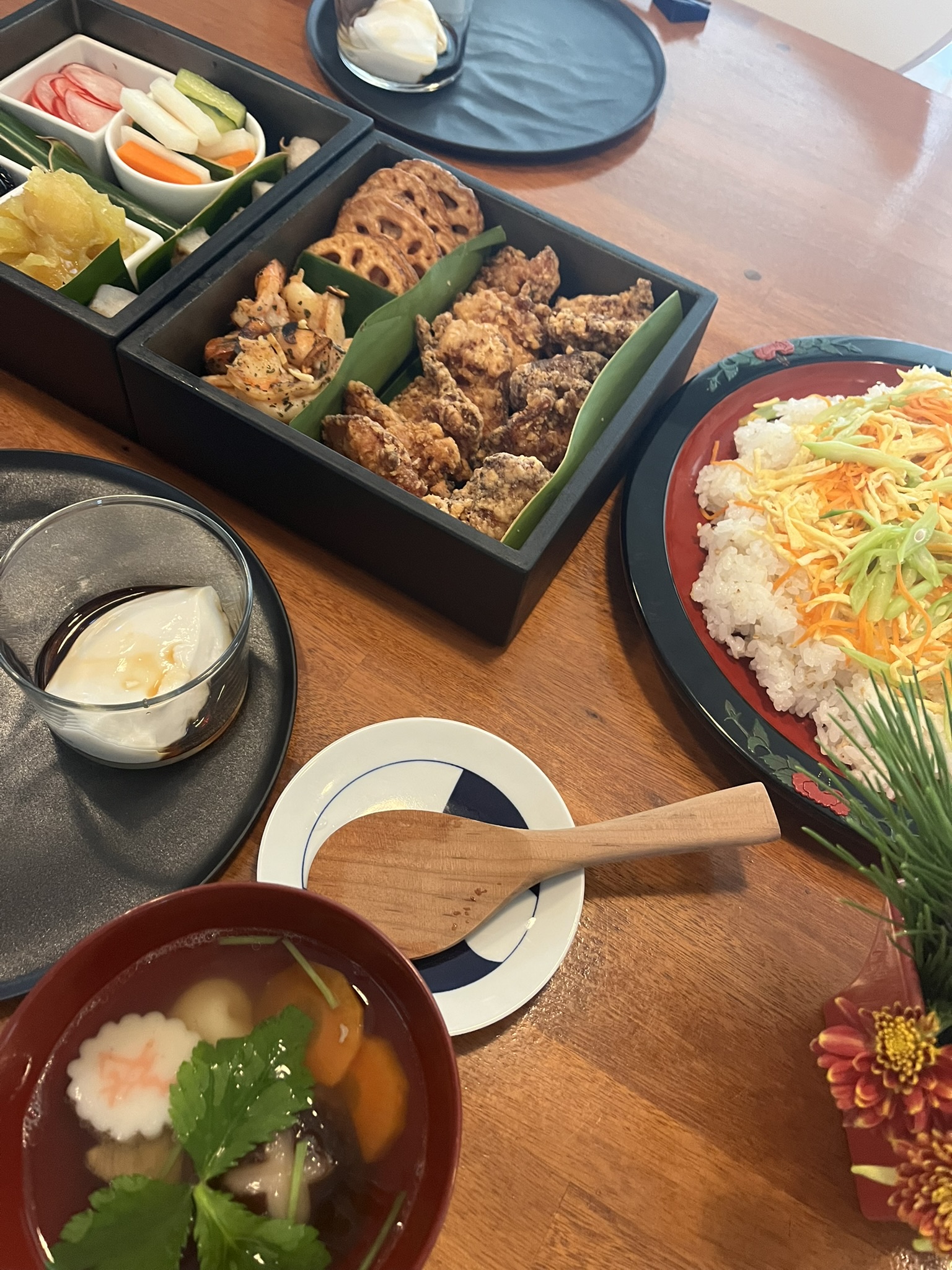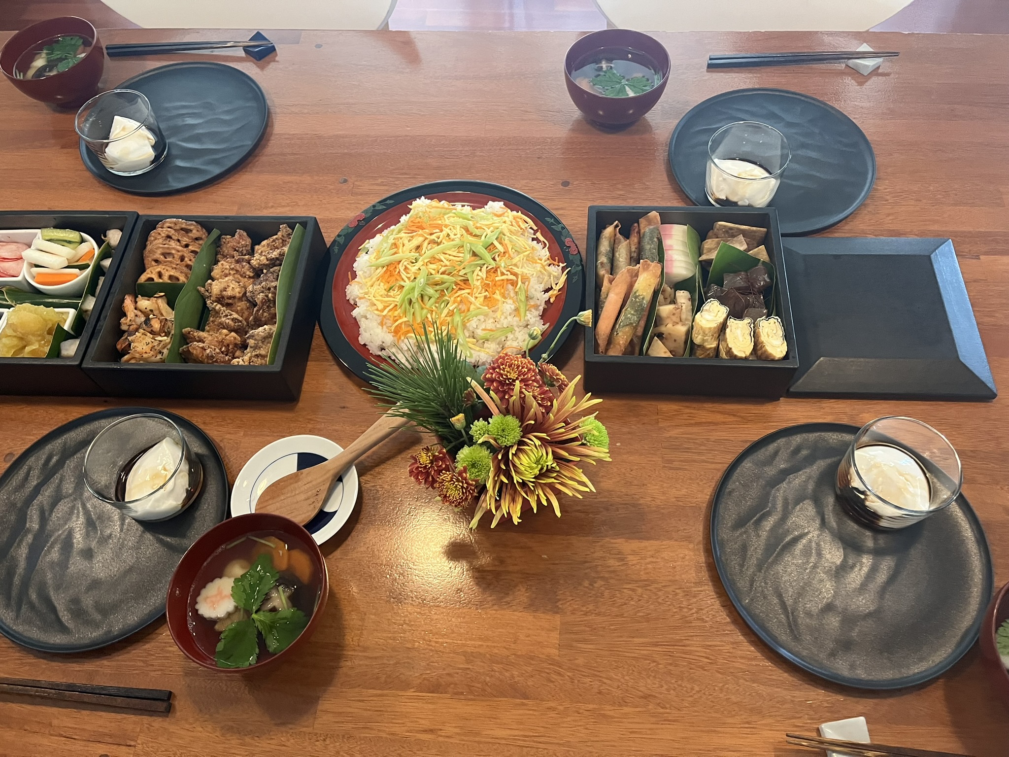 自分のキッチンで好きなメニューでおせちを作り、好きな重箱にそれらを詰めてテーブルの上に並べる。
