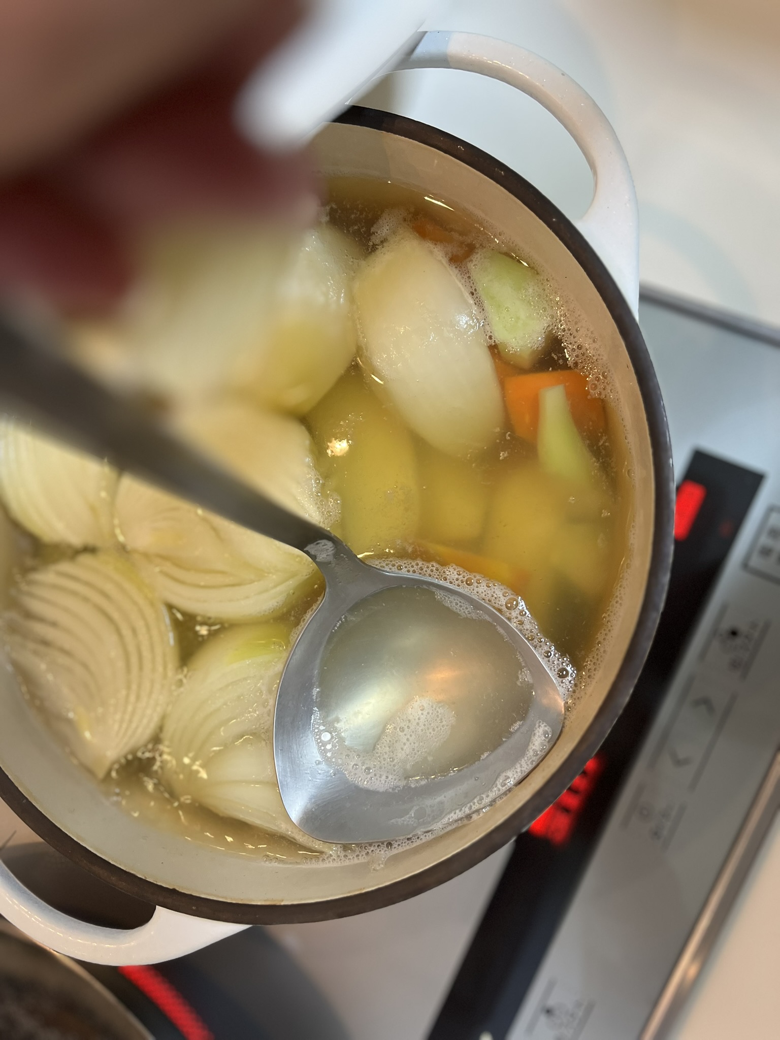 このレードル、三角形っぽい形をしていて、鍋の縁にピタッと沿うため、 汁をすくいやすく、アク取りもラク。