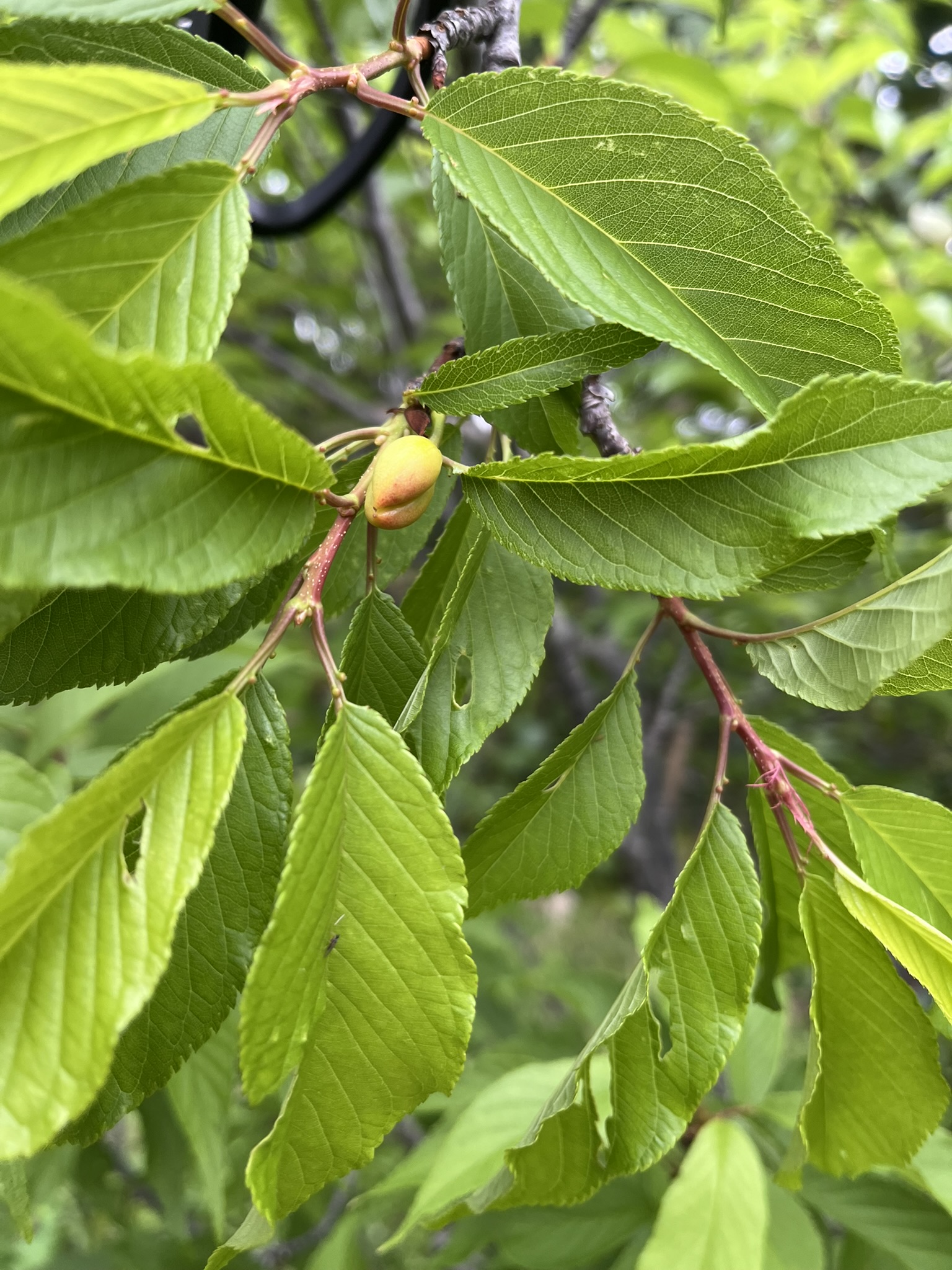 今は葉桜になり、サクランボの実が付き、黄緑色から少しずつ赤みを帯びています。