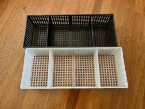 これは31年前にDaisoで買った収納グッズ。当時、入れたいモノを入れる収納道具が売っていなくて収納に悩んでいました。なので、これを見つけた時は、飛んで喜んだ記憶があります。